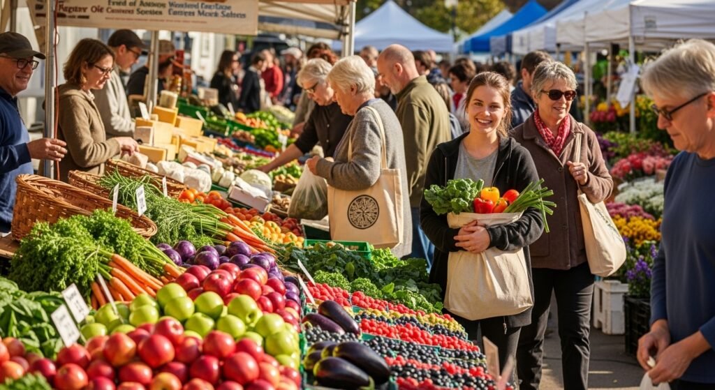 Let’s explore another practical way to incorporate sustainability into your lifestyle – shopping for local produce at your neighborhood farmers’ market.